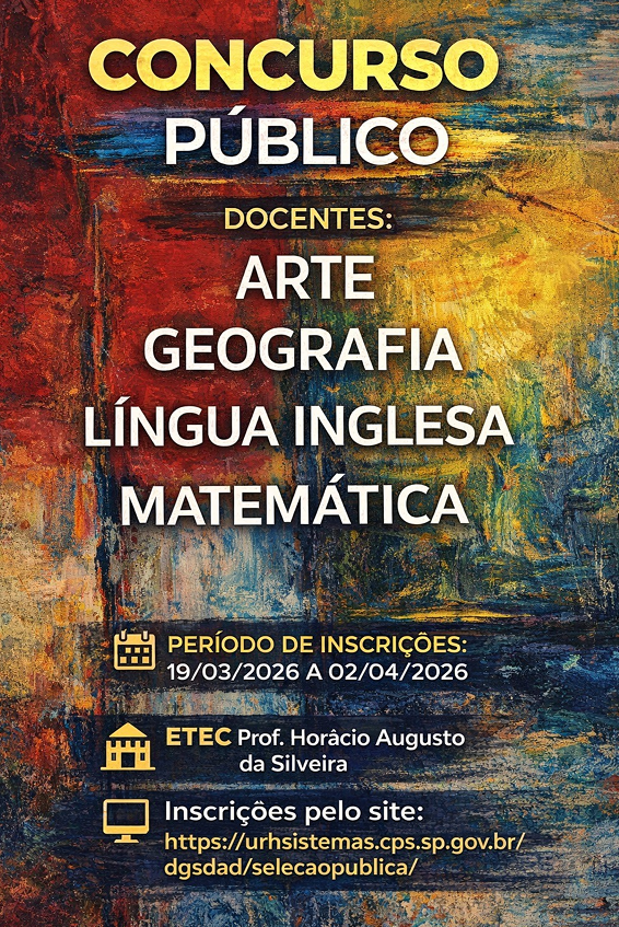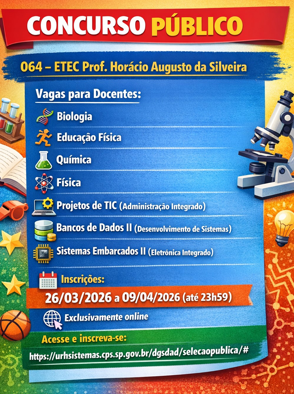 Concurso para Docentes – 2026 Autor do post:Etec Horácio Augusto da Silveira Post publicado:março 27, 2026 Categoria do post:Trabalhe Conosco visualizações: 304 A Escola Técnica Estadual Prof. Horácio Augusto da Silveira está com inscrições abertas para o concurso de docentes em diversas áreas. Confira as oportunidades disponíveis abaixo: 🔔 Inscrições somente online. Acesse: Inscrições Aqui ✅ Antes de inscrever-se leia o edital. 🌟 Participe e faça parte de nossa equipe dedicada à excelência e inovação na educação! 🌟 Você também pode gostar Processos Seletivos Simplificados para Docentes – maio de 2025 maio 8, 2025 Processos Seletivos Simplificados para Docentes – agosto 2025 agosto 21, 2025