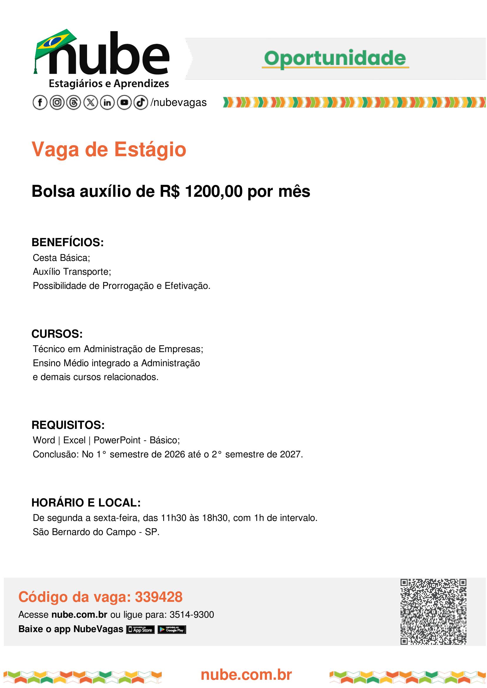 Estágios Confira as vagas de estágio disponíveis👇Também são publicadas vagas de estágio no Painel próximo à Secretaria da Escola!(clique nas imagens abaixo para visualizar em tamanho maior) Mantenha seu currículo atualizado nas principais plataformas de vagas de estágios.Consulte outras oportunidades de nível médio/técnico disponíveis no Portal do Nube! Abrir site NUBE Abrir site CIEE Lei do Estágio Passando para compartilhar uma ótima dica! Você já se perguntou “preciso ter experiência para estagiar?” O Nube te ajuda! Se interessou? Dá uma olhada no nosso site https://www.nube.com.br/ e aproveite para se candidatar em alguma oportunidade!