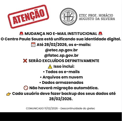 Em razão dessa atualização, os serviços educacionais vinculados aos domínios @etec.sp.gov.br e @fatec.sp.gov.br serão descontinuados em 28/02/2026.