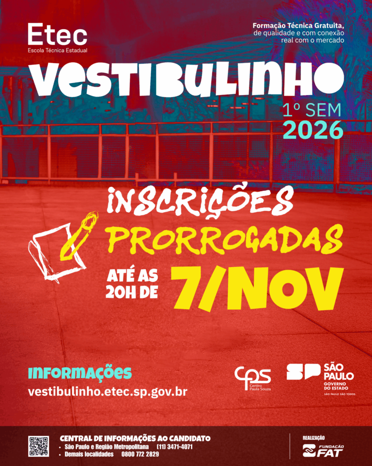 Vestibulinho 2026 – inscrições prorrogradas Autor do post:Etec Horácio Augusto da Silveira Post publicado:setembro 11, 2025 Categoria do post:Vestibulinho visualizações: 758 Estão abertas as inscrições para o vestibulinho ETEC 2026 Inscrições de 10/09 a 07/11 – acesse: https://vestibulinho.etec.sp.gov.br Você também pode gostar Vestibulinho 2025 – 2º semestre maio 13, 2025